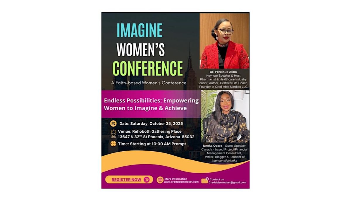 Welcome to the Imagine Women's Conference: Empowering Women to Imagine and Achieve! Join us for a day filled with inspiring speakers, interactive sessions, and networking opportunities. This is a live event in Phoenix, AZ where you will receive proven strategies and practical tools and learn how to leverage the power of your imaginatination to unravel big ideas that transform lives. Get ready to be inspired, motivated, empowered, and equipped with the tools to turn your dreams into reality. Don't miss this incredible opportunity to connect with like-minded women and unleash your full potential. See you there!