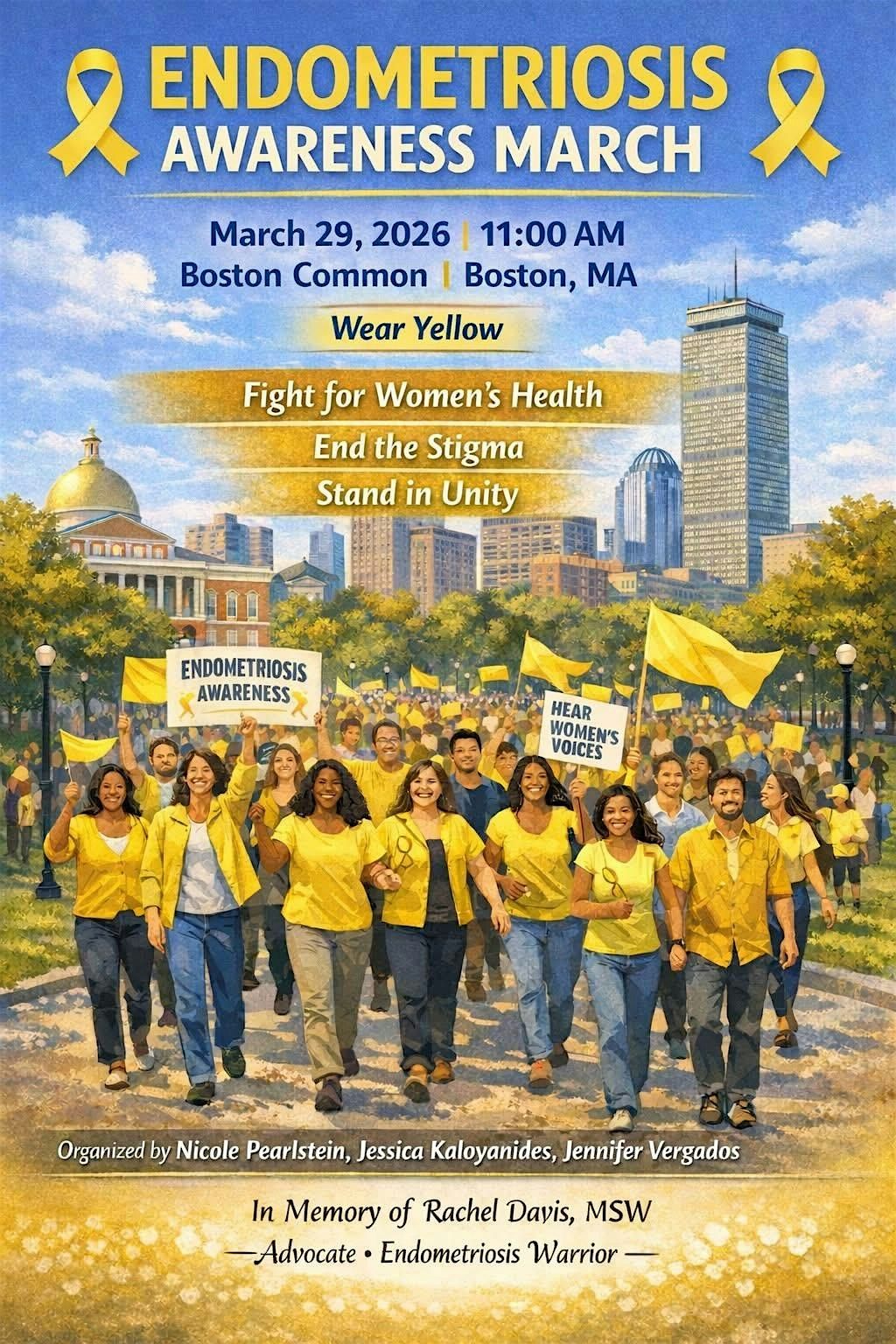 Welcome to the Endometriosis Awareness March in Honor and memory of advocate Rachel Davis happening at Boston Common on March 29, 2026 at 11:00 AM (Eastern Time)! Join Boston's advocates and providers in raising awareness about this important cause. Let's come together, show our support, and march for those affected by endometriosis. Wear yellow to show solidarity and help spread the word. Together, we can make a difference. See you there!