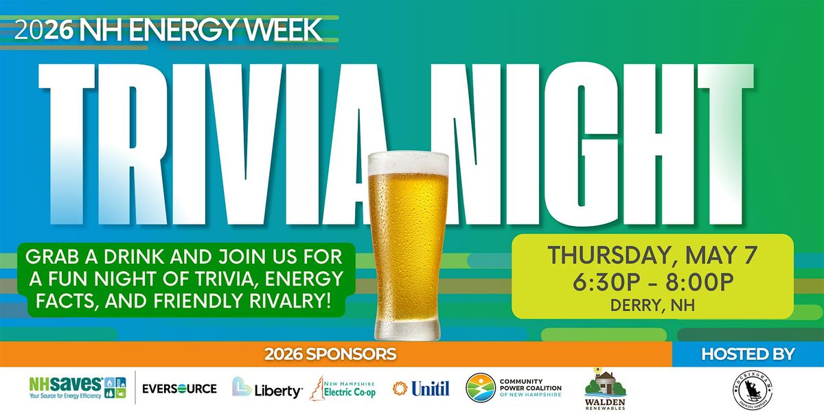 Join the 2026 NH Energy Week organizing partners at Rockingham Brewing Company in Derry! Enjoy a range of food from their kitchen, Teenie Wienie Canteenie, and drink options and show off your trivia skills at this fun-for-everyone event from 6:30p - 8:00p.