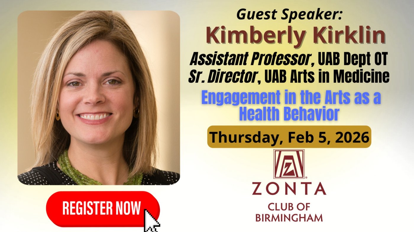 Join the Zonta Club of Birmingham for an inspiring and thought-provoking program that explores how creative engagement supports healing, wellness, and overall health throughout the lifespan. As Zontians committed to advancing the status of women and girls, this conversation invites us to consider the arts not just as enrichment, but as a powerful and evidence-based health behavior that can strengthen individuals, families, and communities.