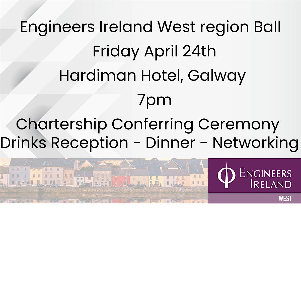 Engineers Ireland - West Region will host our social on the 24th of April 2025 in the Hardiman Hotel, Galway City at 7pm. Whether you are looking for an opportunity to bring your colleagues together or host a reunion with friends and peers, the Engineers Ireland West Region Social, will be a fantastic night of entertainment. The event will commence with a drinks reception at 7pm followed by a three-course dinner with wine at 8:00pm followed by dancing until late.Tickets are €95 or a table of 10 for €900 If you would like to discuss your table requirements, you can contact the team on [email protected]