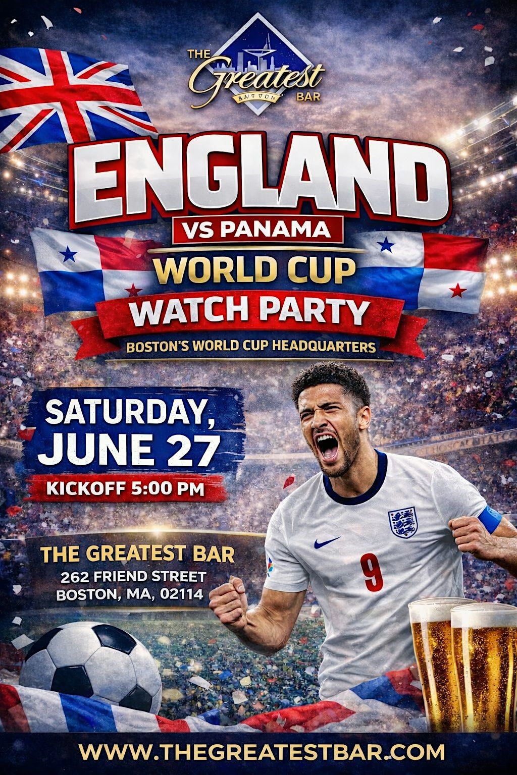 Join us at The Greatest Bar, Boston’s World Cup Headquarters, for an exciting England vs Panama World Cup Watch Party.
