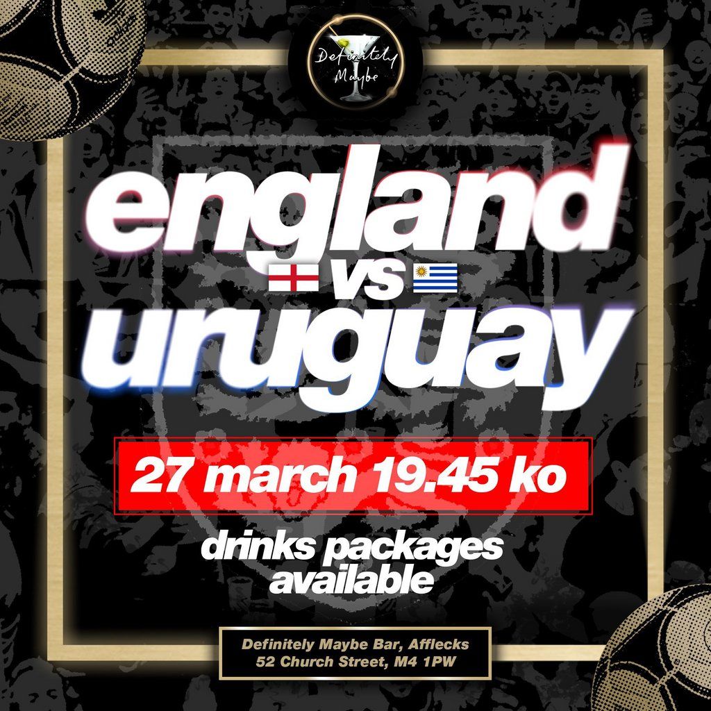 England vs Uruguay screening live at Definitely Maybe! Big screens, drinks packages and live music before & after the game.