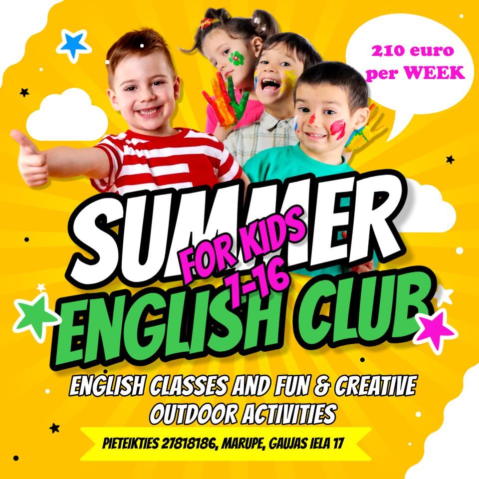 Tuvojas vasara- sākam rezervāciju “English Kids Club”! Pie mums viss notiek tikai angliski runājošā vidē! Lielisks veids, kā brīvā gaisotnē mācīties angļu valodu - spēles, rotaļas, sarunas un citas tematiskās aktivitātes angļu valodā. Bērni interesantā un aizraujošā veidā apgūst ne tikai angļu valodas prasmes: runāt, rakstīt, klausīties un lasīt, bet arī mācās savstarpēji draudzēties un kopā lietderīgi pavadīs vasaras brīvlaiku.Programmā: