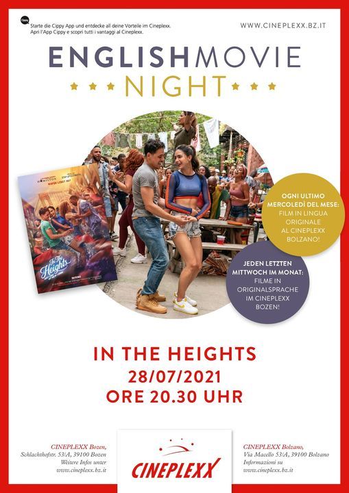 ENGLISH MOVIE NIGHTJeden letzten Mittwoch im Monat werden im Cineplexx Bozen Filme in Originalsprache gezeigt! Die nächste English Movie Night findet am 28. Juli 2021 um 20:30 Uhr mit dem Film IN THE HEIGHTS statt.