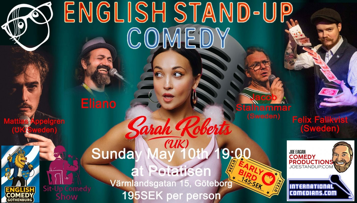 Join us for a fun-filled evening of laughs and giggles for English Comedy Gothenburg Night on Sunday, May 10th with Sarah Roberts (UK)