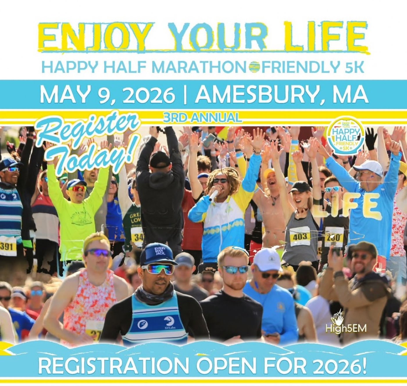 The 3rd Annual Enjoy Your Life Happy Half Marathon and Friendly 5k this Spring will be the most fun and exciting race event in the area! The half marathon course is a challenging one that weaves its way through three picturesque towns offering you the most beautiful backdrop of farmland, open space, countryside, and a touch of downtown Amesbury, MA. The 5K is beautiful an out and back to everyone's favorite open space - Battis Farm! When you cross that finish line, the after-party celebration will be underway with music, local vendors, healthy snacks, food trucks, beer from Mill 77 Brewery and more!