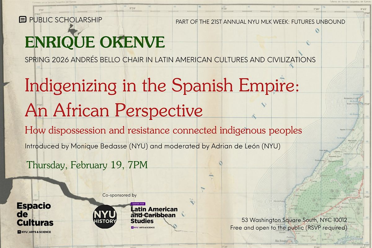 Join us for the inaugural lecture by Andrés Bello Chair Enrique Okenve (University of the West Indies), exploring the contested meanings of “indigenous” in Equatorial Guinea within the history of the Spanish Empire. The talk examines how colonial policies, memories, and local resistance shaped processes of indigenization across Africa, the Americas, and the Pacific. Introduced by Monique Bedasse and moderated by Adrian de León (NYU History).