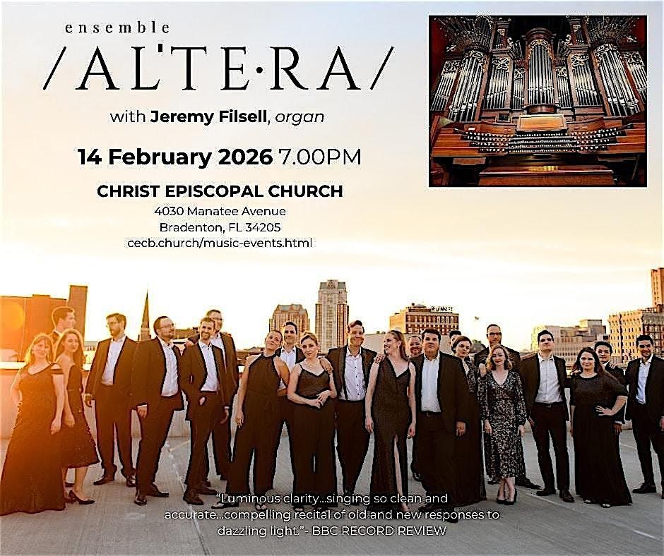 Welcome to the ensemble AL'TE - RA concert at Christ Episcopal Church! Join us on February 14, 2026 at 7:00 PM for an unforgettable evening of music. Get ready to be mesmerized by the talented musicians as they take the stage. Don't miss this opportunity to experience the magic of live music in person. Mark your calendars and invite your friends for a night to remember! See you there!