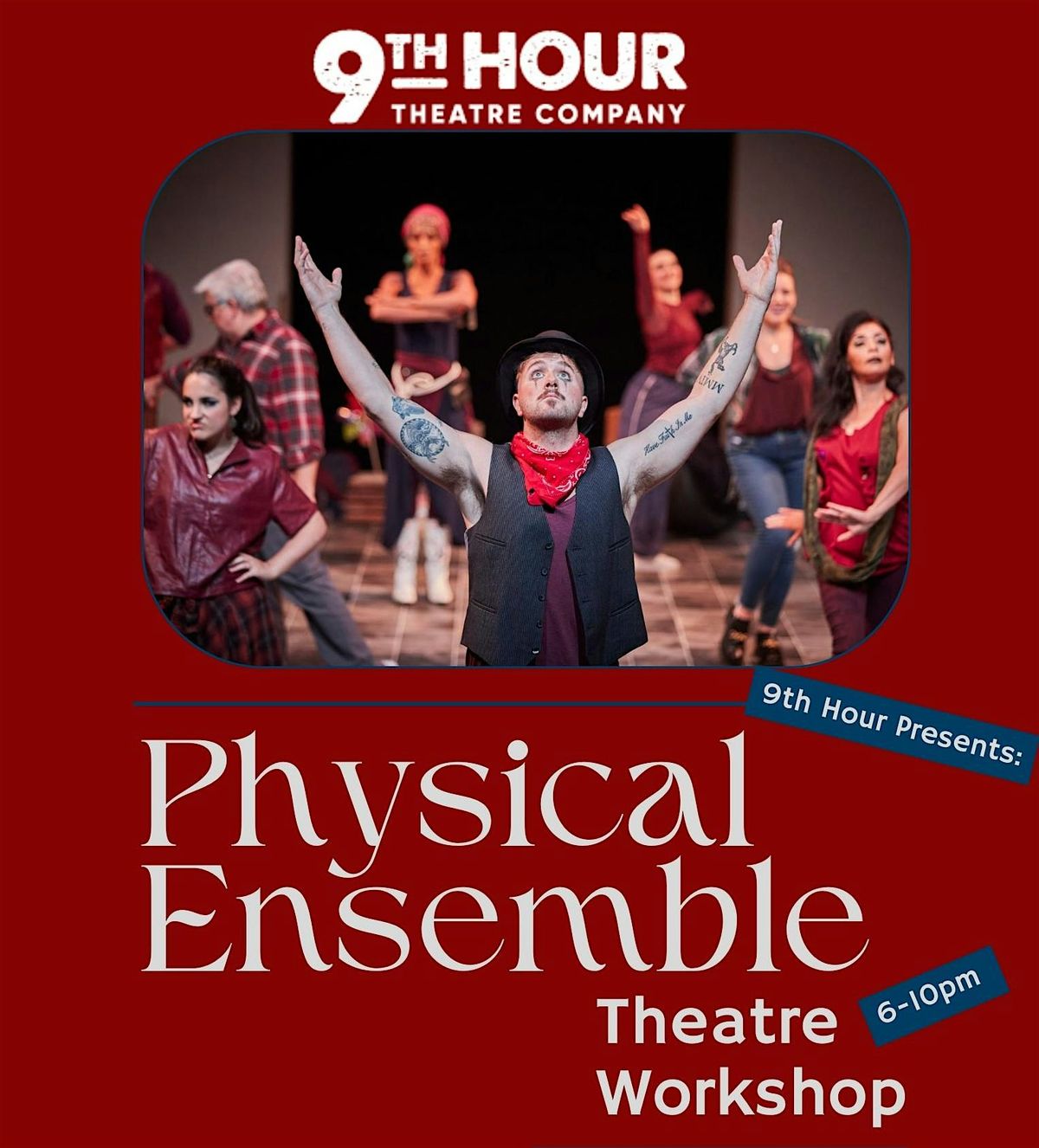9th Hour defines physical ensemble theatre as working together to tell a story in which all performers take on multiple roles and are all equally essential in telling the story. The emphasis is on high touch, high impact, expressive sound and movement, often involving close contact.