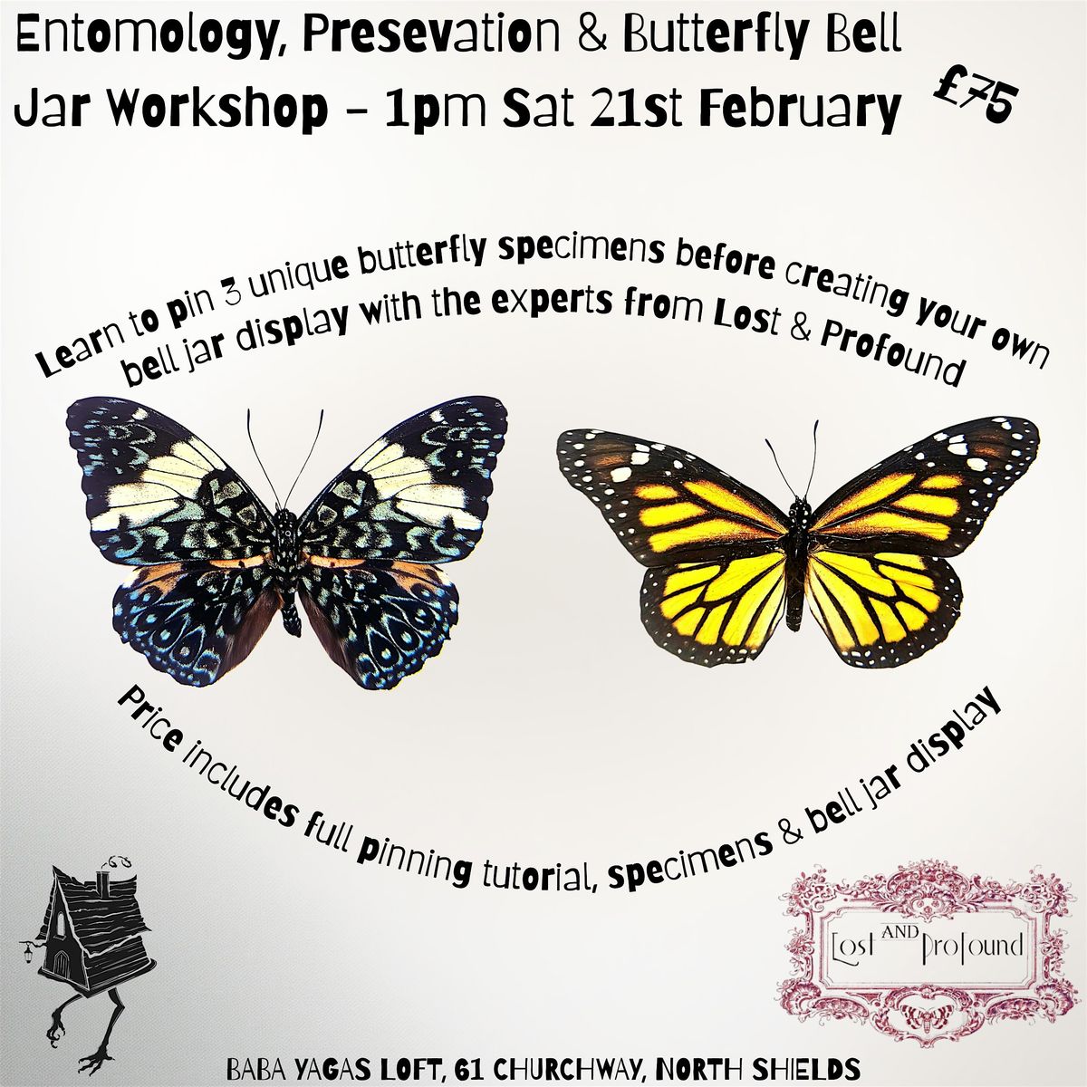 Get ready to dive into the fascinating world of butterfly entomology! Join us in person for a hands-on unique workshop where you'll learn the basics of butterfly pinning and create your very own beautiful butterfly bell jar. Price includes 3 specimens, bell jar and full tutorial.
