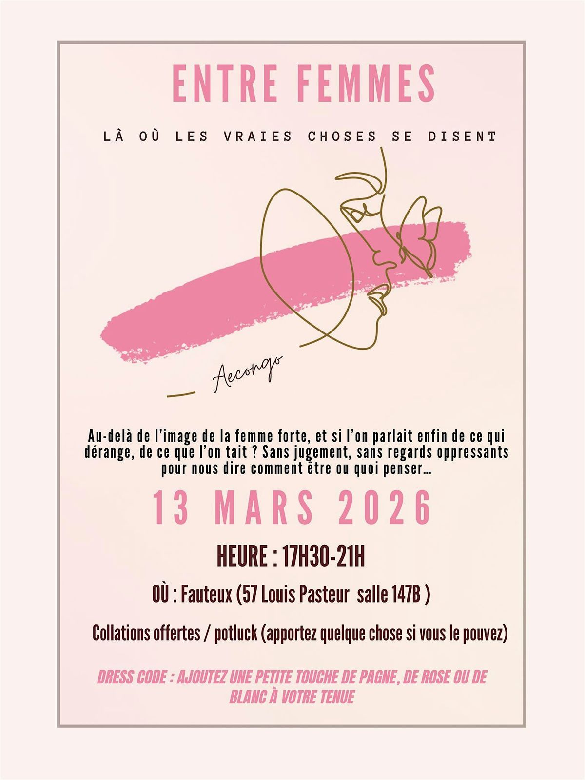Rejoignez-nous le 13 mars 2026 pour « Entre Femmes » Un moment d’échange sincère et sans jugement.