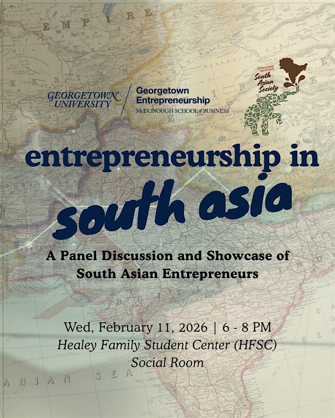 South Asia is one of the fastest-growing and most dynamic regions in the world, defined by rapid population and economic growth in parallel to stark socioeconomic and gender inequality. Entrepreneurship in the region takes many forms and is a powerful vehicle for social change. This event will include a panel showcasing professionals to explore the entrepreneurial landscape of South Asia today, followed by a networking reception and showcase of products from South Asian entrepreneurs including refreshments. Convened jointly by Georgetown Entrepreneurship and the GU South Asian Society.