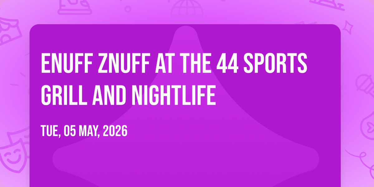 🎉 Welcome to Enuff Znuff at The 44 Sports Grill and Nightlife, where the impossible becomes possible and dreams take flight! 🏛️ Join us at The 44 Sports Grill and Nightlife in the heart of Glendale, AZ for an event that will redefine your expectations. 📅 On May 5th, 2026 at 07:00 PM, witness the transformation of space and time into something truly magical. ✨ It's a curated experience combining the best of innovation, entertainment, and community spirit, creating moments that will be remembered for years to come. Whether you're a first-time visitor or a seasoned enthusiast, prepare to be amazed. 🎊 Book now to ensure your place in this unforgettable experience!