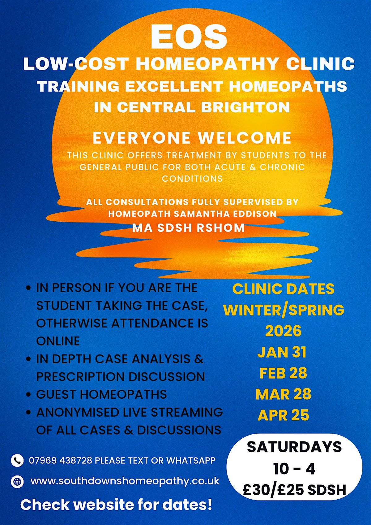Welcome to EOS, a student-run homeopathy clinic, supervised by practicing homeopath Samantha Eddison RSHom. Everyone is welcome. If you wish to attend as a patient, please contact the number on the flyer. If you are a student, just purchase a ticket. There is limited space in the clinic but no limits online. The zoom link for each clinic will be emailed to everyone the Friday before the clinic. Any enquiries or questions please contact me on the number below.