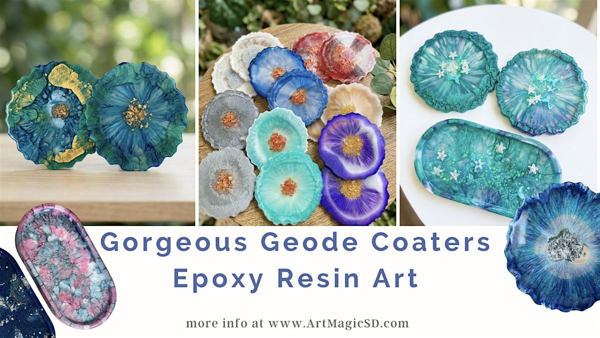 Looking for fun things to do in San Diego? Dive into the mesmerizing world of epoxy resin art at Art Magic Creative Studio! Our Gorgeous Geode Coasters Workshop is one of the most unique and exciting art classes for adults in San Diego.