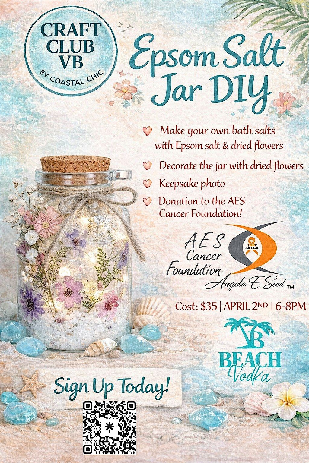 Join us for a relaxing and creative evening at Beach Vodka as we make beautiful Epson Salt Jars with pressed flowers!🌸✨