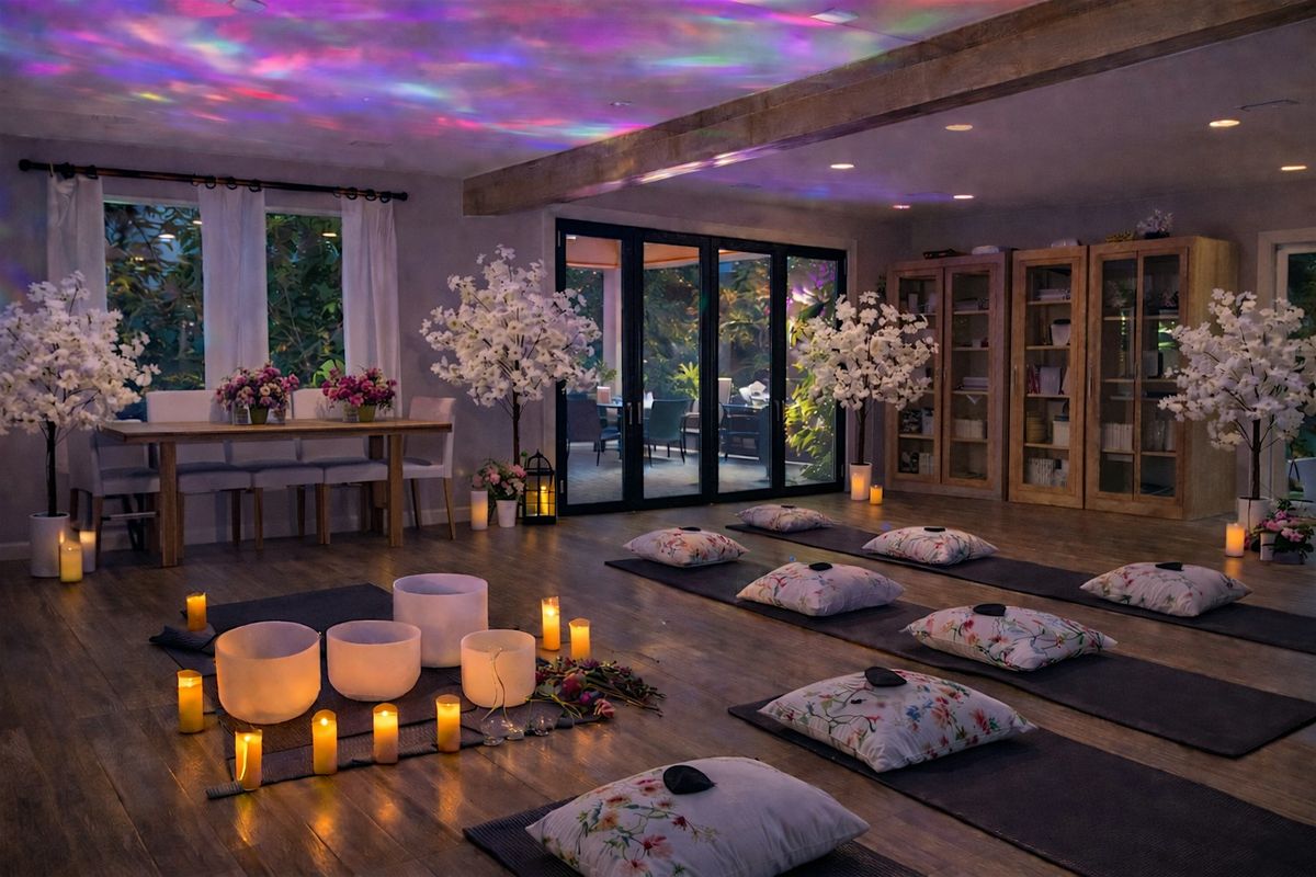 The room is set with soft, radiant mood lighting that creates the feeling of being held within an aura-like sanctuary. As the sound journey unfolds, the body softens, awareness deepens, and a natural sense of harmony begins to move through the nervous system—allowing you to recalibrate from the inside out.