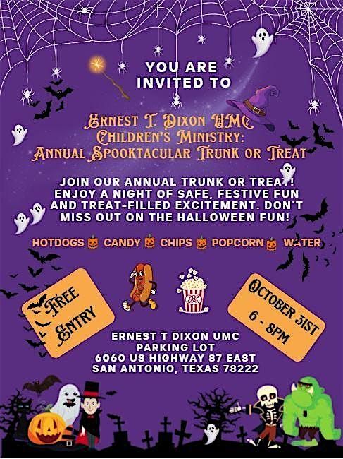 Welcome to the Ernest T. Dixon UMC Children’s Ministry Annual Spooktacular Trunk or Treat Event! Join us for a fun-filled evening where kids can trick or treat from decorated car trunks - a twist on the traditional Halloween festivities. Enjoy a night of safe, festive fun and treat-filled excitement. Don't miss out on the Halloween Fun! Come on down with your little ones for a spooktacular time!