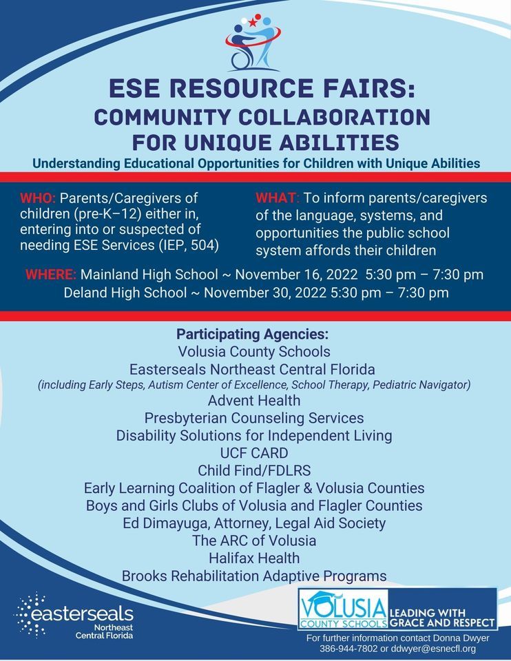 Do you have questions about ESE Services for your child? WE HAVE ANSWERS! Come to our ESE Resource Fairs:Understanding Educational Opportunities for Children with Unique Abilities ~ Mainland High School ~ November 16, 2022 5:30 pm – 7:30 pm