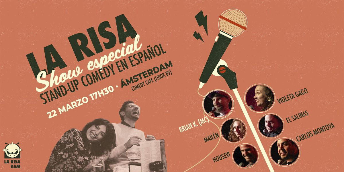 Con los mejores cómic@s hispanohablantes de la escena local: Carlos Montoya (Venezuela) · Violeta Gago (España) · El Salinas · Housevi · Mailén (Argentina) y Brian K como conductor de carcajadas.