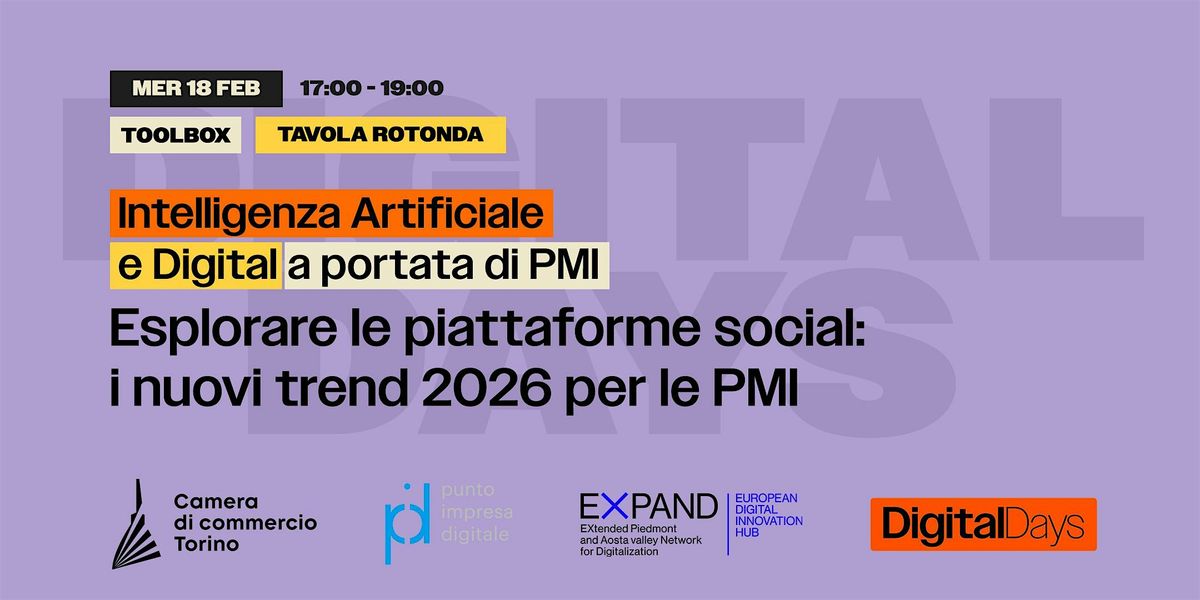 L’evento è parte integrante della rassegna “Intelligenza Artificiale e Digital a portata di PMI”, promossa da Camera di commercio di Torino e Associazione Digital Days. Un ampio programma di eventi per esplorare come l’IA e il digitale possano essere utilizzati per potenziare le strategie aziendali e promuovere l’innovazione nelle PMI