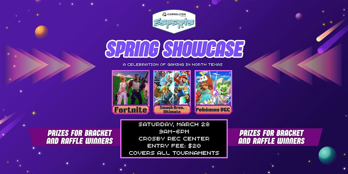 Get ready for the ultimate gaming experience at our Spring Showcase event! Come to the Crosby Rec Center on March 28 and play in thrilling tournaments featuring Fortnite, Smash Bros. Ultimate, and Pokémon VGC. This event is open to everyone in the community, & you can enter in unlimited brackets for a chance to WIN prizes. ENTRY FEE: $20. For more info, visit the tournament page: https://www.start.gg/tournament/spring-showcase-2026/details