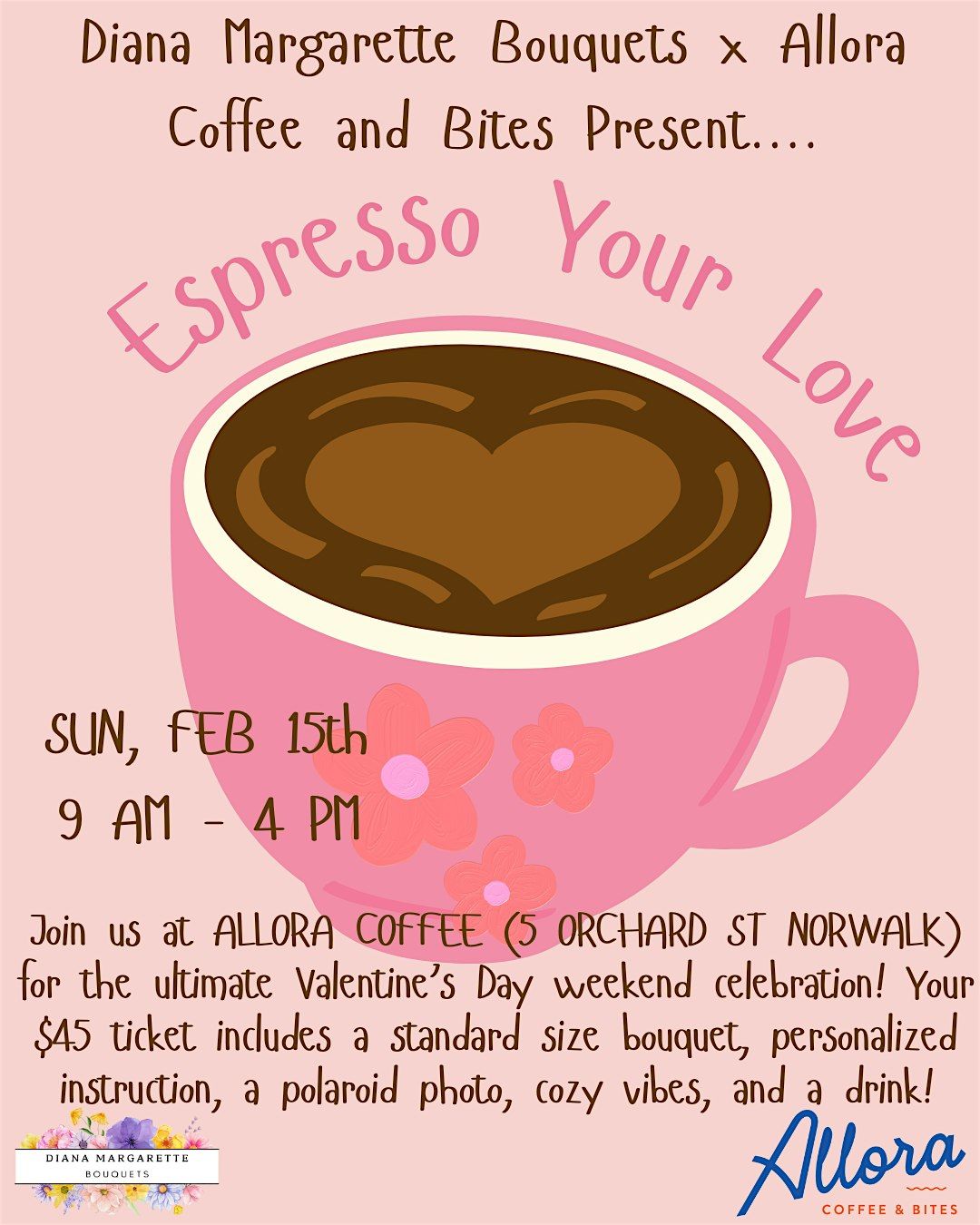 Celebrate Valentine's Day Weekend in the best way: with coffee and flowers! This awesome collab between Diana Margarette Bouquets and Allora Coffee and Bites is running all day! Your ticket includes bouquet building instructions, a standard size bouquet with all flowers of your choosing, cozy vibes, a polaroid so you can always remember your bouquet, and a drink of your choice! Can't wait to see you all here :)