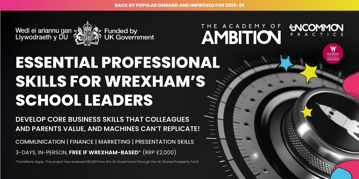 This free Essential Professional Skills Programme, tailored specifically for Wrexham's school leaders, will equip you with practical, real-world, professional, human skills that form the foundation of every successful career, and which are vital if you want to lead with impact.
