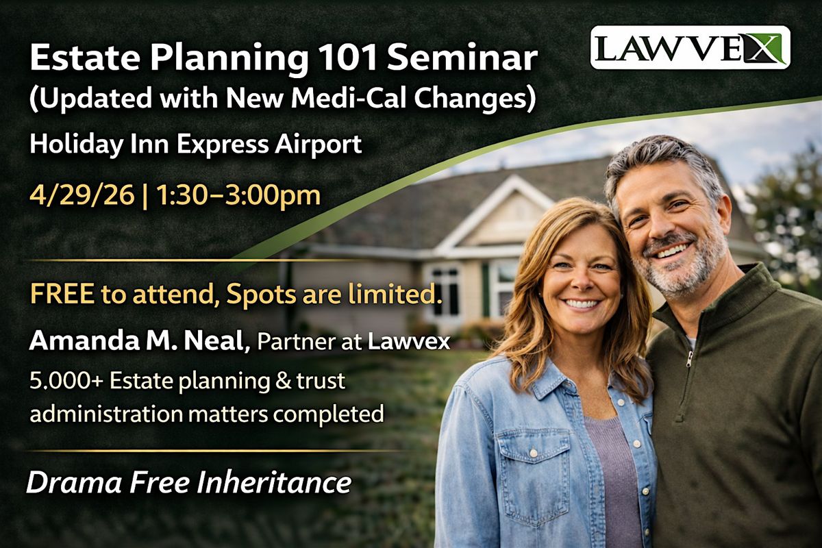 Join us on April 29, 2026 at 1:30 PM (Pacific Time) for a relaxed and informative session on estate planning. We'll cover the latest updates on Medi-Cal and what they mean for you and your family. This is a great chance to get your questions answered and learn the basics without any jargon. The event takes place at 5089 E McKinley Ave. Don’t miss out on this easy-going seminar designed to help you plan ahead with confidence!