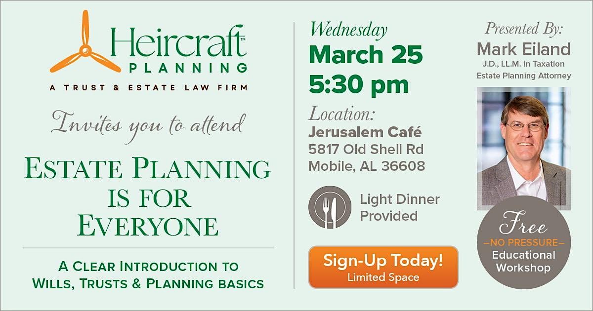 This seminar is presented by Mark Eiland, J.D., LL.M. in Taxation, attorney and founder of Heircraft Planning. He is admitted to practice law in Alabama and Florida.