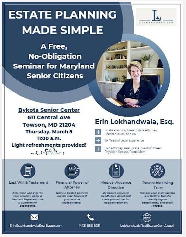 Join me for my next estate planning seminar at the Bykota Senior Center in Towson on Thursday, March 5 at 11 a.m.About this Event