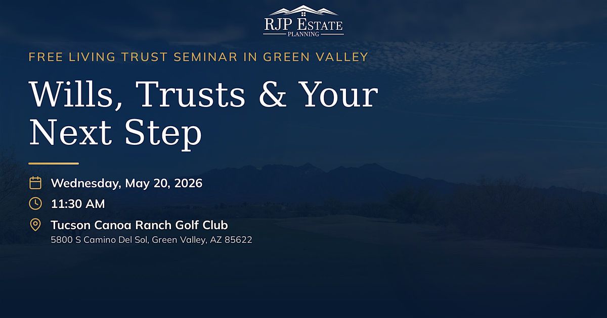 Join us for an informative estate planning seminar on Wednesday, May 20, 2026 at 11:30 AM at Tucson Canoa Ranch Golf Club in Green Valley, Arizona.Register on our website: https://rjpestateplanning.com/seminars/green-valley/2026-05-20In just 90 minutes, you'll get clear answers about:Wills vs. Trusts - understand the key differences and which is right for youRevocable Living Trusts - how they help you avoid Arizona probate entirelyAsset Protection - strategies to shield your money from creditors and unintended heirsIncapacity Planning - powers of attorney and medical directives that ensure your wishes are honoredInheritance Safeguards - protecting your children's inheritance from divorce or creditorsCommon Mistakes - costly errors families make and how to avoid themPresented by Clint Smith, Estate Planning Attorney and author of Estate Planning: A Plain English Guide to Wills and Trusts, alongside Lenny Trujillo, Senior Planning Consultant with 25+ years of advisory experience.This is a free, no-obligation educational seminar. Seating is limited - register today to reserve your spot.