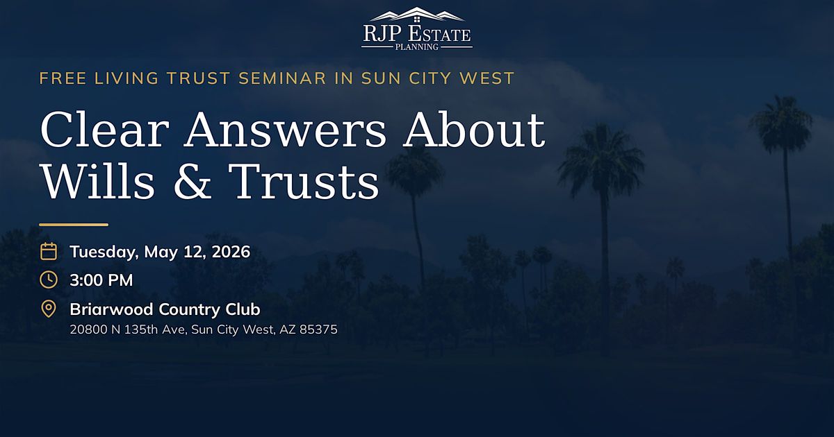 Join us for an informative estate planning seminar on Tuesday, May 12, 2026 at 3:00 PM at Briarwood Country Club in Sun City West, Arizona.Register on our website: https://rjpestateplanning.com/seminars/sun-city-west/2026-05-12In just 90 minutes, you'll get clear answers about:Wills vs. Trusts - understand the key differences and which is right for youRevocable Living Trusts - how they help you avoid Arizona probate entirelyAsset Protection - strategies to shield your money from creditors and unintended heirsIncapacity Planning - powers of attorney and medical directives that ensure your wishes are honoredInheritance Safeguards - protecting your children's inheritance from divorce or creditorsCommon Mistakes - costly errors families make and how to avoid themPresented by Clint Smith, Estate Planning Attorney and author of Estate Planning: A Plain English Guide to Wills and Trusts, alongside Lenny Trujillo, Senior Planning Consultant with 25+ years of advisory experience.This is a free, no-obligation educational seminar. Seating is limited - register today to reserve your spot.