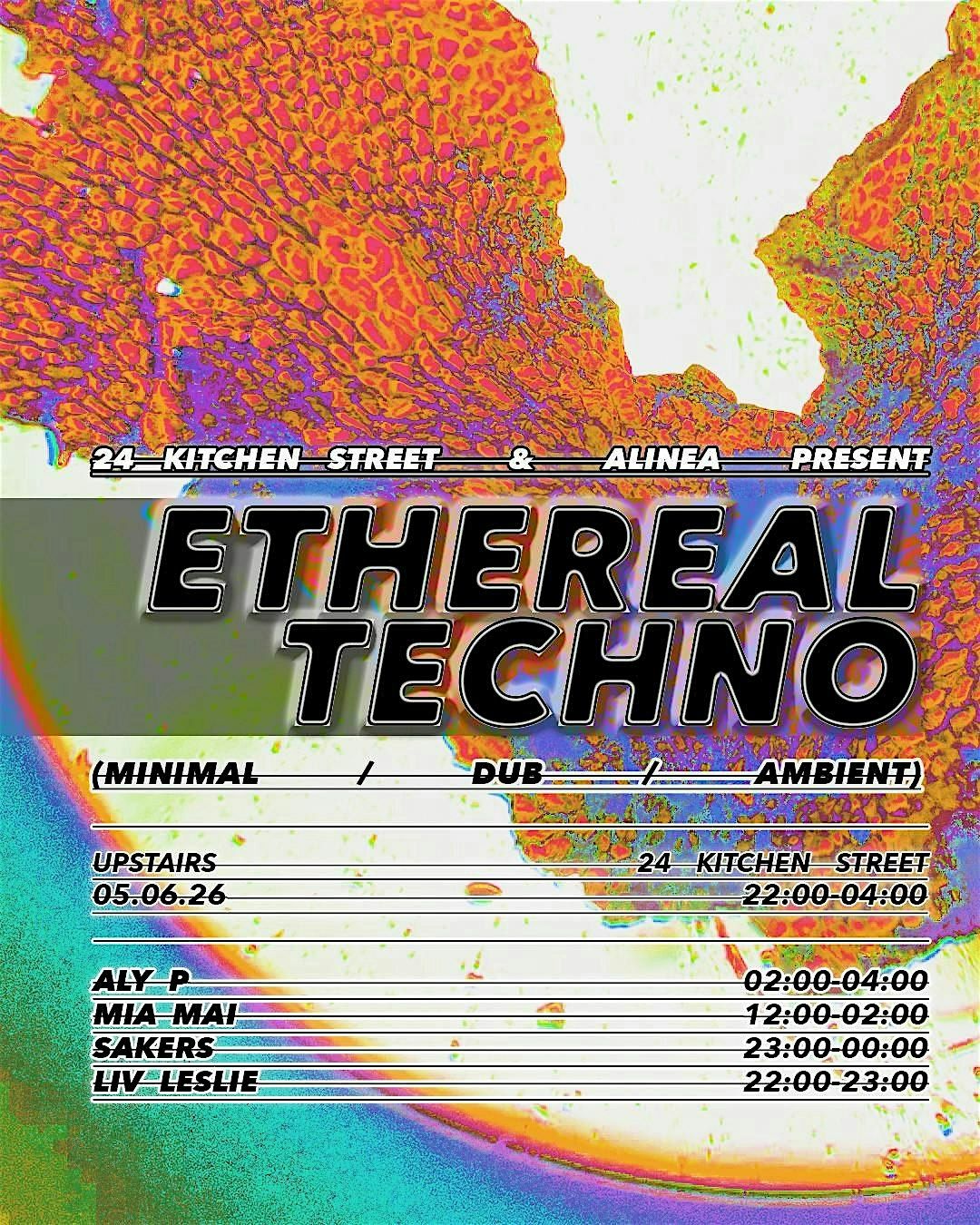 Join us in the Green Room, upstairs at 24 Kitchen Street from 10pm-4am for an Ethereal night of Techno.