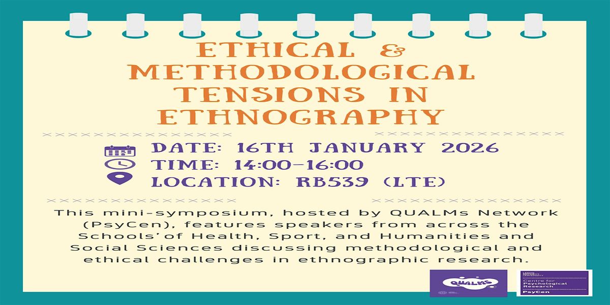 This mini-symposium, hosted by the Qualitative Methods Support (QUALMs) Network of PsyCen, will host speakers from across LBU (Schools of Health, Sport, and Humanities and Social Sciences) discussing their experience of methodological and ethical tensions in ethnographic methods.