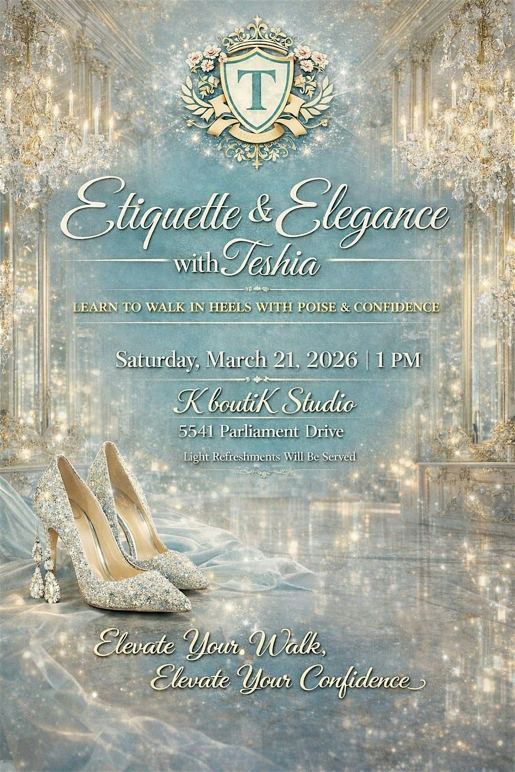 This is the reschedule from 3/14/26 Step into elegance and confidence at Etiquette & Elegance with Teshia, an in-person heel walking etiquette class designed to teach posture & presence.
