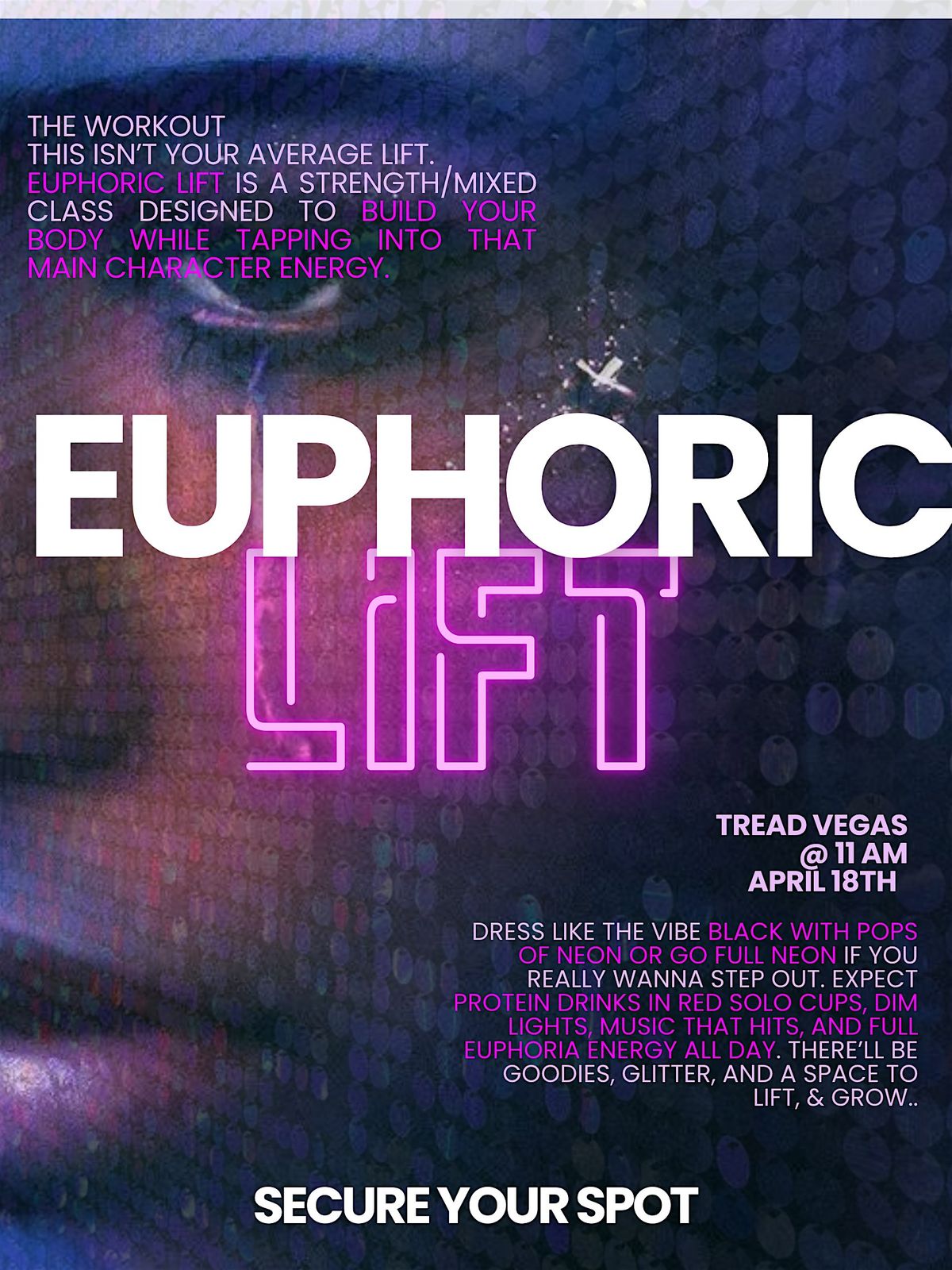 high-energy strength class, dim lights + electric vibes. Euphoria theme black, neon, glitter. Mocktails, goodies + birthday vibes
