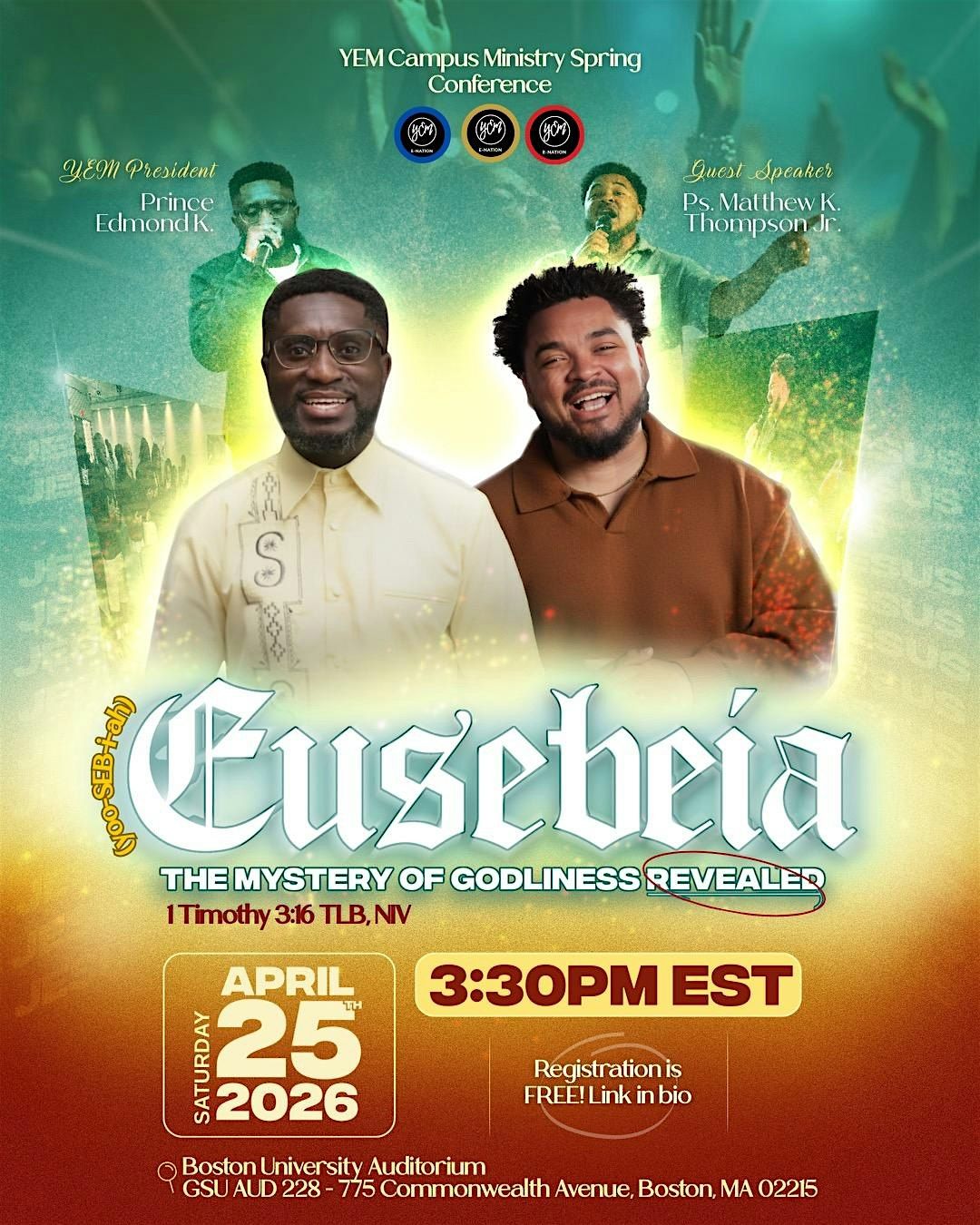 The heart of this conference is to call students into Christ-centered, Spirit-led living on campus. Using eusebeia (godliness) as our framework, we aim to help students move away from performance-based faith and toward reverent devotion rooted in who Christ is and what He has revealed.