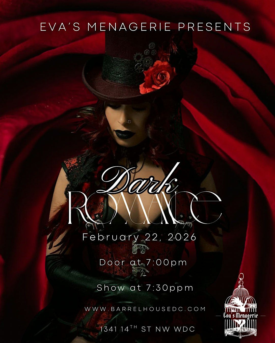 Join us February 22nd at Barrel House Cafe and Bar for Eva's Menagerie - Dark Romance. Be immersed in a world of sensual delight and dark whimsy, where audience doesn't just spectate, but become a part of the show! Featuring a delicious cast of DC and New York's most talented burlesque dancers and aerialists; Eva's Menagerie is DC classic vaudeville experience with a scandalous twist.