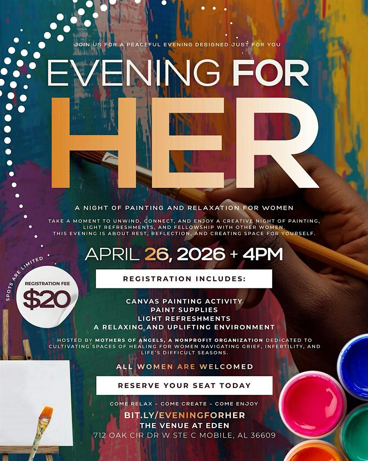 A moment to unwind, connect, and enjoy a creative night of painting, light refreshments, and fellowship with other women. This evening is about rest, reflection, and creating space for yourself. Must be 18 or older.