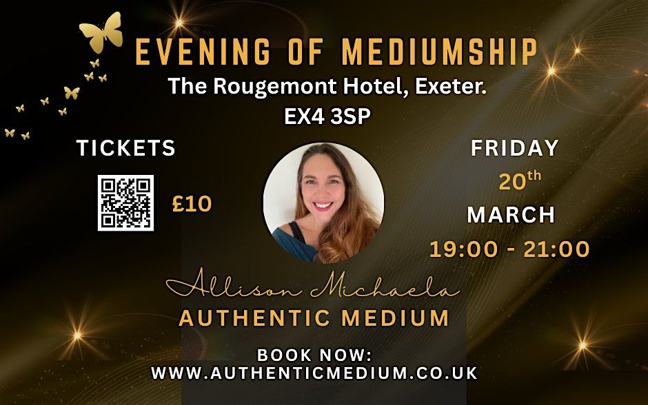 Authentic Medium, Allison Michaela is in Exeter hosting what will be a fabulous Evening of Evential mediumship. With clients across the globe, she brings a heartfelt connection to your loved ones in spirit. Allison is an evidential medium, card and runes reader. The evening will bring laughter, love and a few tears. Enjoy this wonderful venue a bar is available for you to buy drinks. Tickets are limited so advanced purchase is recommended.