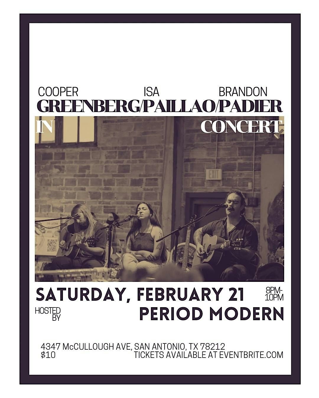 Enjoy a night of hand written songs performed by local troubadours, Isa Paillao (Chavela), Brandon Padier (Black Gold, The Texases), and Cooper Greenberg (Favorite Son, The Texases), hosted by the imposingly curated furniture front, Period Modern.