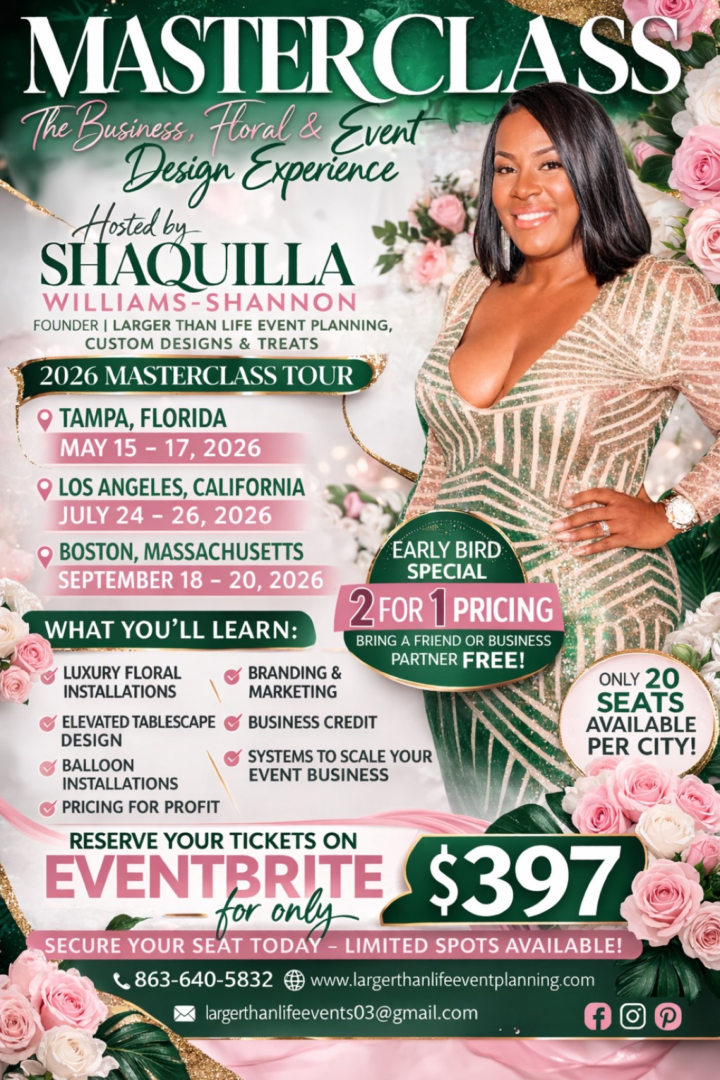 you will learn directly from Shaquilla Williams-Shannon, founder of Larger Than Life Event Planning and lead event designer known for creating extravagant, larger-than-life event experiences.