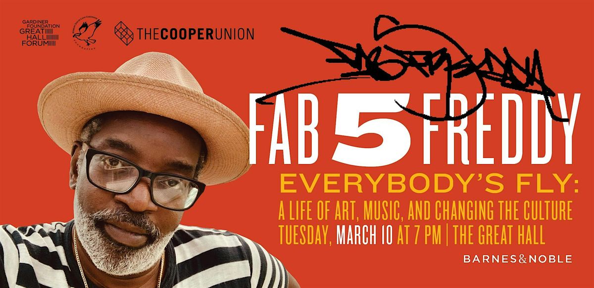 Join Fab 5 Freddy for a special Cooper Union Gardiner Foundation Great Hall Forum event celebrating the release of his first memoir, Everybody’s Fly: A Life of Art, Music, and Changing the Culture. It is an essential, street-level cultural history into how New York’s underground art and music scene—guided by Fab 5 Freddy’s singular vision of what could be possible—irrevocably transformed mainstream culture from the late 1970s to today. Barnes & Noble Union Square will be on site with books available for purchase.