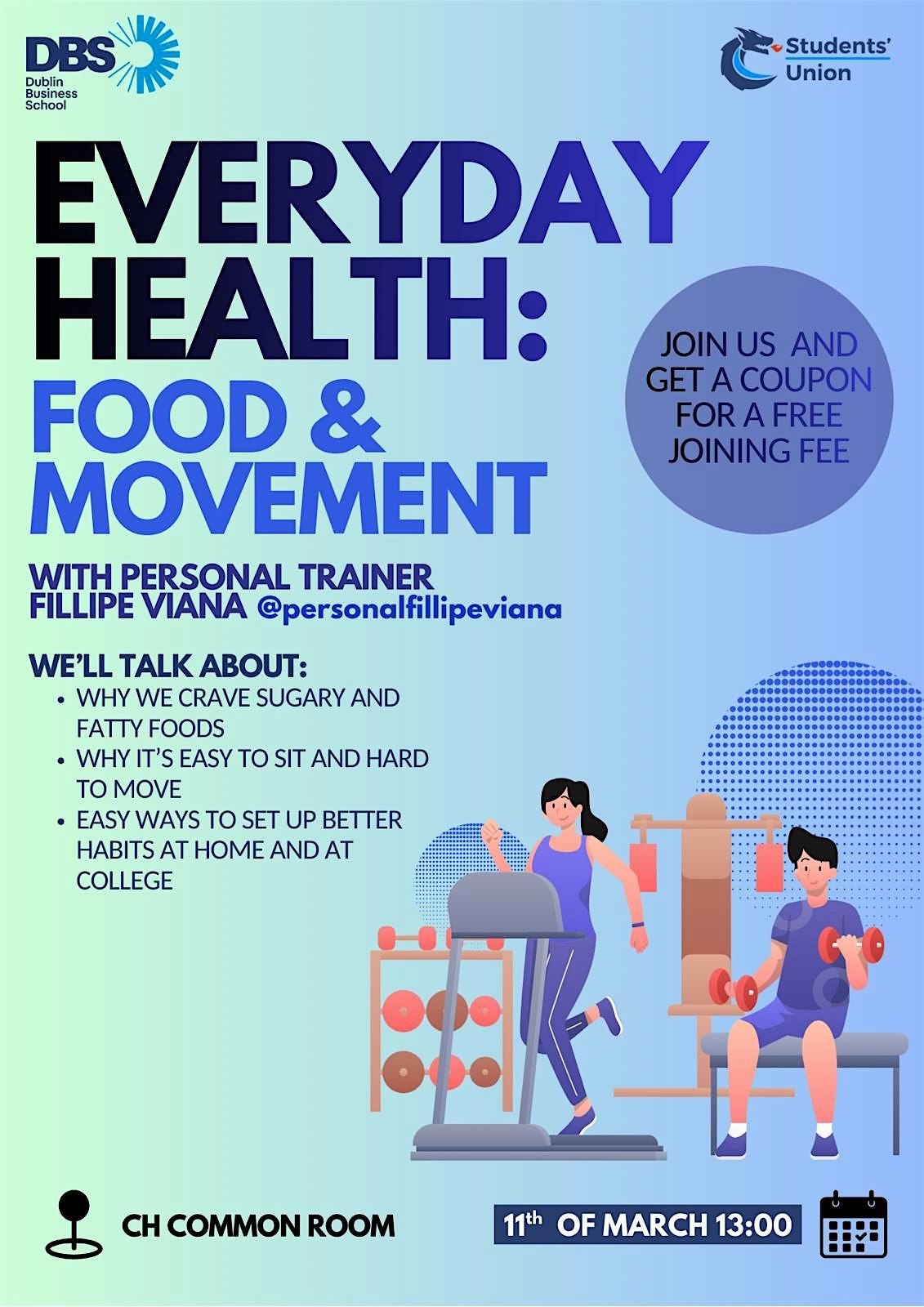 Join us for an engaging and practical session on building healthier everyday habits with Personal Trainer Fillipe Viana. This talk is designed especially for students who want simple, realistic ways to improve their wellbeing through better nutrition and movement.
