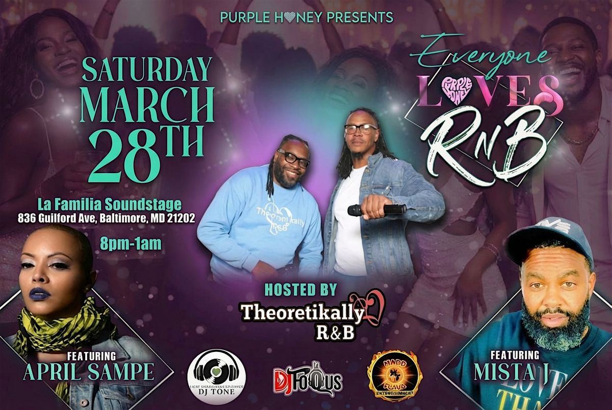 Purple Honey Presents: Everyone Loves RnB — Hosted by Theoretikally R&B is a premier, culture-driven R&B experience uniting Purple Honey Entertainment and Theoretikally R&B for one unforgettable night of live music and grown-folk energy. Enjoy powerhouse performances from April Sampe and Mista J, plus a seamless soundtrack of R&B classics and favorites by DJ Focus and DJ Tone. After the show, Theoretikally R&B keeps the night alive with a high-energy afterparty featuring 90s jams, neo-soul, and contemporary bangers. VIP packages offer premium seating and exclusive perks. Bring your crew, dress to impress, and get ready for nonstop vibes. Everyone Loves RnB… and this night will remind you why.