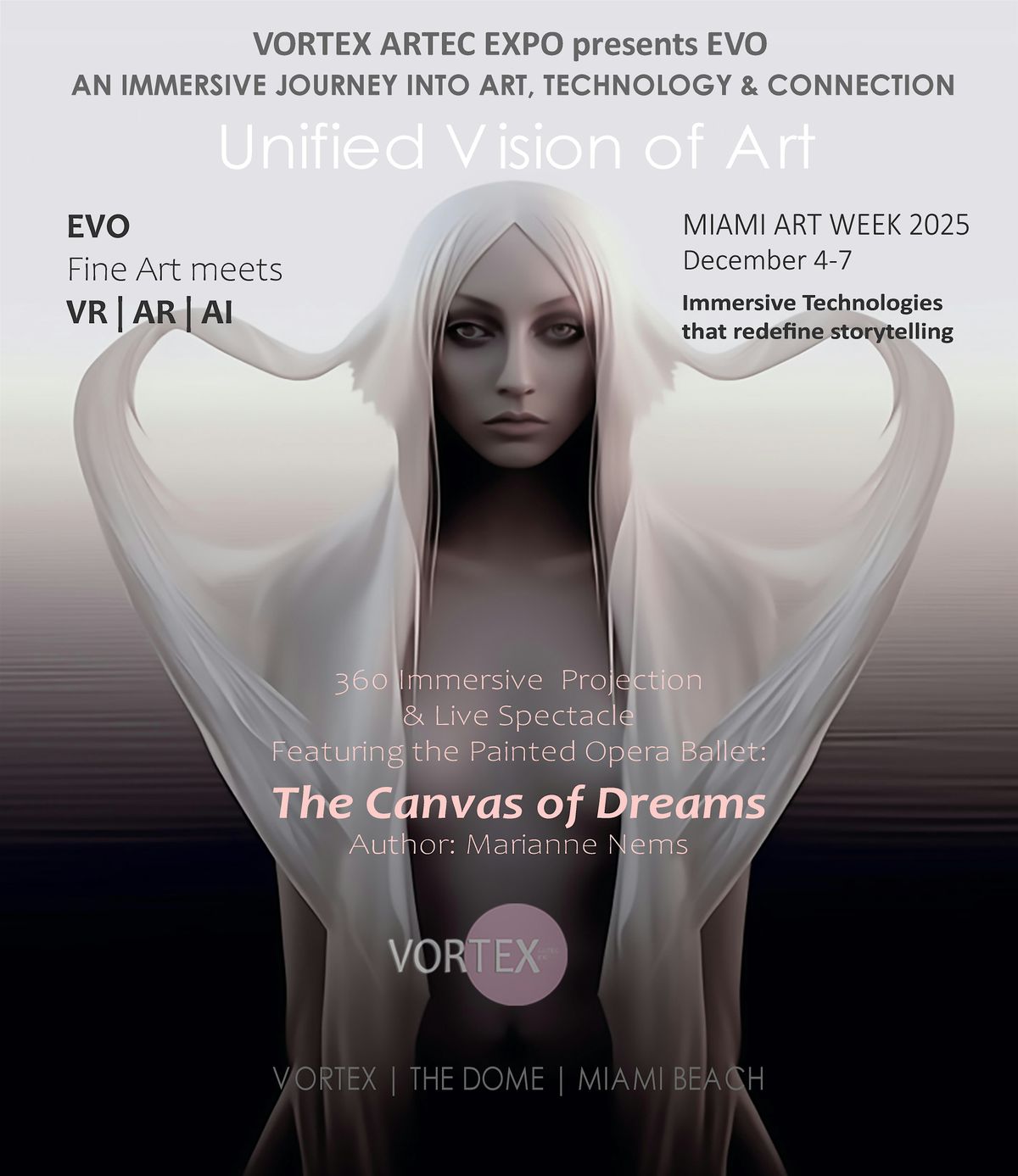 Join founder Marianne Nems for a spectacular evening of art and technology at the VORTEX ARTEC EXPO on Miami Beach.