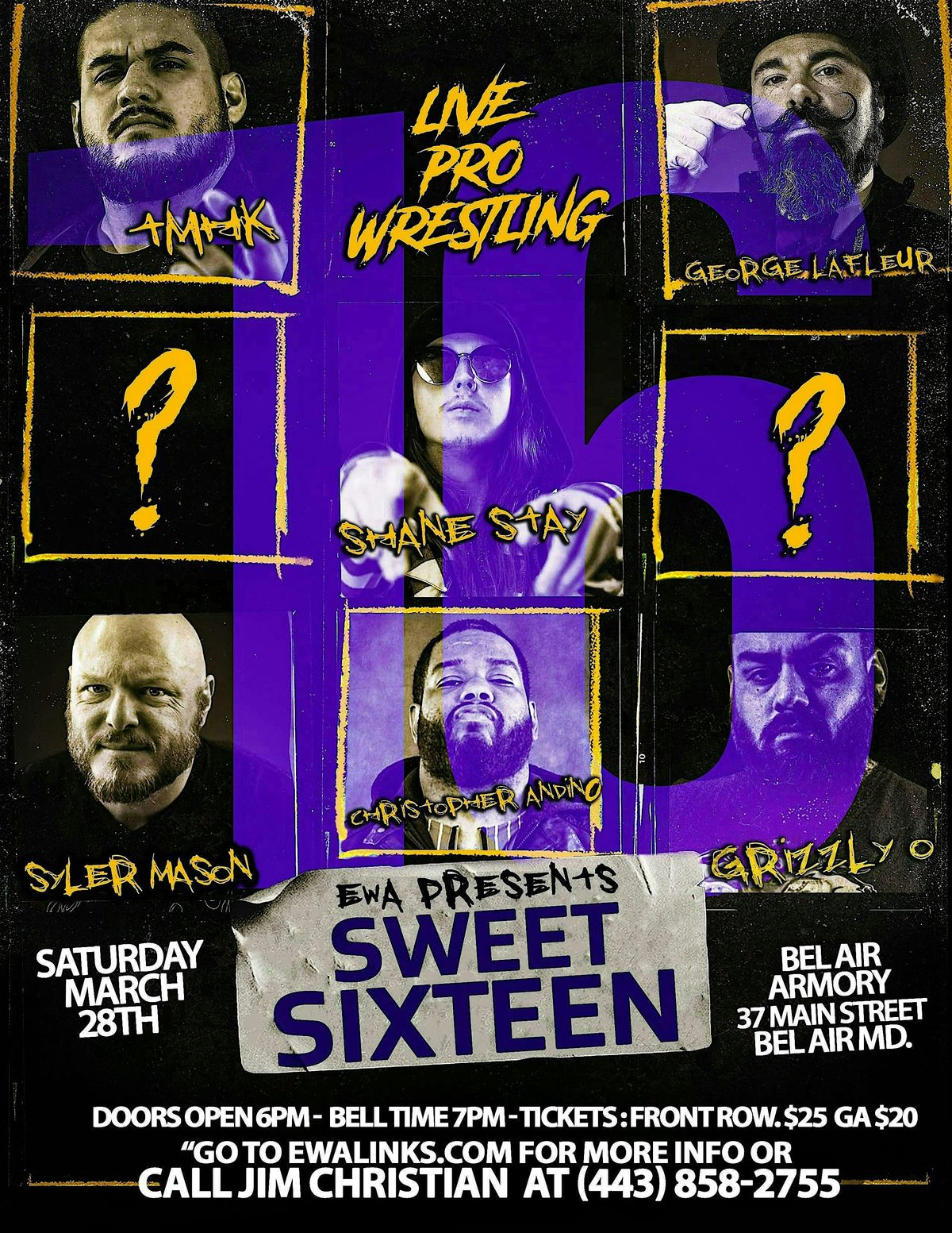 Welcome to EWA Live Pro Wrestling Sweet Sixteen 2026. Get ready for an action-packed night of intense matches and thrilling showdowns at the Bel Air Armory. Witness your favorite wrestlers battle it out in a show that you need to see to believe. Don't miss out on this epic event that will leave you on the edge of your seat. Grab your tickets now and join us for a night you won't forget.