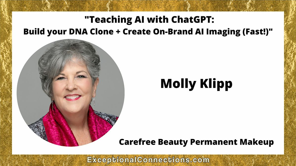 In Molly’s 20-minute talk she will share: “Teaching AI with ChatGPT: Build your DNA Clone + Create On-Brand AI Imaging.” (Fast!)